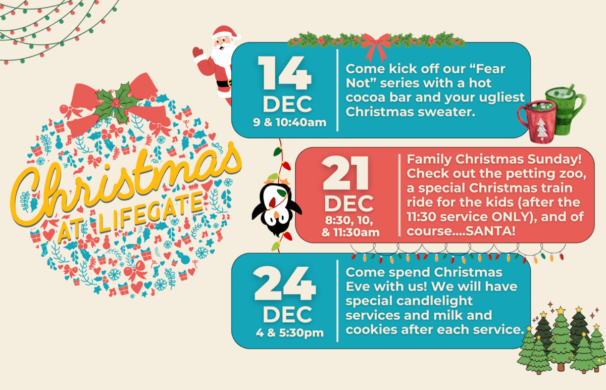 Join us on the 21st for a petting zoo, a special Christmas train ride after the 11:30am service, and of course…SANTA! Then come back on Christmas Eve for a special candlelight service and some milk and cookies after each service.